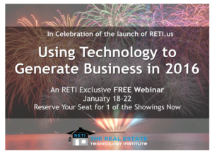 “How Technology Can Help You Generate Business in 2016” In celebration of the launch of the RETI.us website, the entire RETI Team converged to provide tips on how you can use technology to generate business in 2016 including How to Win at Search Engine Optimization (SEO), How to Prospect for Pennies, Using Video & YouTube, Evernote, Targeting Millennials, Social Media and More! Featuring: Craig Grant, Amy Smythe-Harris, Juanita McDowell, Alex Camelio, Warren Dow & Marki Lemons-Rhyal Click to Watch this Webinar on Replay