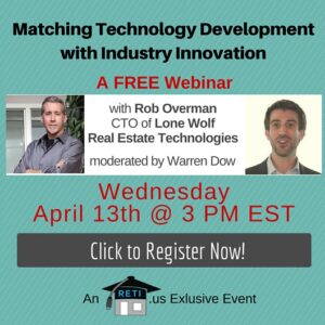 “Matching Technology Development with Industry Innovation” Rob Overman CTO of Lone Wolf Real Estate Technologies one of the most innovative companies in the real estate industry let’s you in on how they approach product development in this fast moving industry. Instructor: Moderated by Warren Dow Wednesday, April 13th @ 3 PM EST Click to Watch this Webinar on Replay