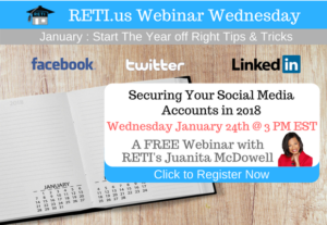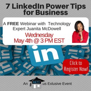 LinkedIn: 7 Power Tips for YOUR Real Estate Business Want to Learn how to Leverage LinkedIn for YOUR Business. Attend this session and get 7 great tips, from RETI team member and LinkedIn Expert/Power User Juanita McDowell. Instructor: Juanita McDowell Wednesday, January 11th @ 3 PM EST Click to Watch this Webinar on Replay