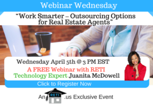Work Smarter – Outsourcing Options for Real Estate Agents Some tasks are time consuming &/or hard to do. RETI’s Juanita McDowell will show YOU how Outsourcing Might be the Solution to Your Problems! Instructor: Juanita McDowell Wednesday, April 5th @ 3 PM EST Click here to Watch this Webinar on Replay