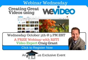 “Building Great Videos with WeVideo” Video is so important in real estate and can be used in so many ways from marketing, to interviews, to education/tutorials and more. In this session, Craig will show you how to build just about any kind of video using WeVideo, the best video editing software and app on the market! Instructor: Craig Grant Rescheduled to Monday October 17th @ 3 PM EST due to Hurricane Matthew Click to Watch this Webinar on Replay