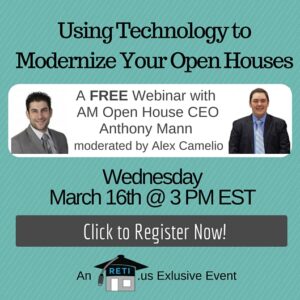 “Using Technology to Modernize Your Open Houses” Open Houses have basically been the same thing for ages. Well not anymore! Anthony Mann, the CEO of AM Open House will share with Alex some creative and brilliant ideas on how you can use technology to modernize and optimize your opens! Instructor: Anthony Mann of AM Open House & Alex Camelio of RETI Wednesday, March 16th @ 3 PM EST Click to Watch this Webinar on Replay