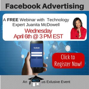 “Facebook Advertising” Learn how to advertise and grow your business on Facebook, the world’s largest social media site with RETI team member Juanita McDowell! Instructor: Juanita McDowell Wednesday, April 6th @ 3 PM EST Click to Watch this Webinar on Replay