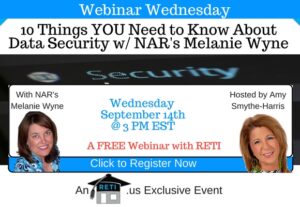 “10 Things YOU Need to Know About Data Security w/ NAR’s Melanie Wyne” In this special RETI webinar, Melanie Wyne, NAR’s Senior Technology Policy Representative will cover why Data Security is so important to today’s REALTOR. Hosted by RETI’s Amy Smythe-Harris. Instructor: Amy Smythe-Harris Wednesday, September 14th Click to Watch this Webinar on Replay