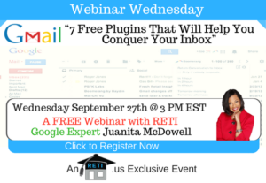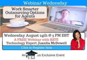 “Work Smarter – Outsourcing Options for Real Estate Agents” Some tasks are time consuming &/or hard to do. RETI’s Juanita McDowell will show YOU how Outsourcing Might be the Solution to Your Problems! Instructor: Juanita McDowell Wednesday August 24th @ 3 PM EST Click to Watch this Webinar on Replay