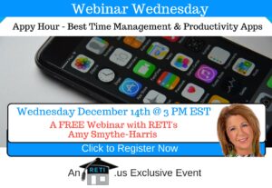 Appy Hour – Time Management & Productivity Apps Webinar Known around the industry as one of the most creative and progressive REALTORS, RETI team member Amy Smythe-Harris will share some of her best practices that she uses to promote her listings! Instructor: Amy Smythe-Harris Wednesday, December 14th @ 3 PM EST Click to Watch this Webinar on Replay