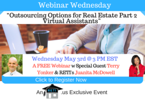 Outsourcing Options for Real Estate Part 2 – Virtual Assistants In this session Juanita McDowell will discuss with our special guest Terry Yonker, the advantages and challenges of using virtual assistants. Instructor: Juanita McDowell Wednesday, May 3rd @ 3 PM EST Click here to Watch this Webinar on Replay